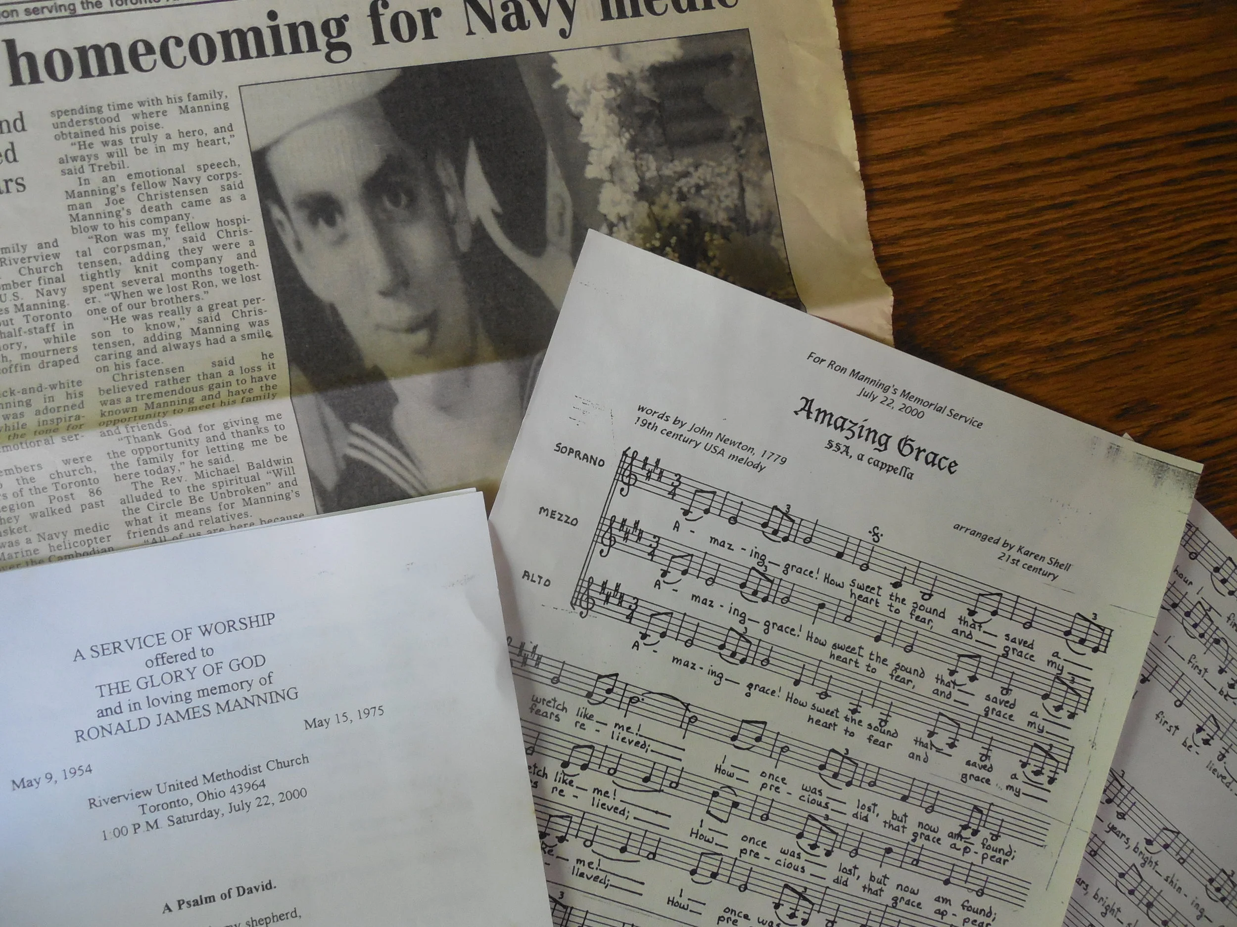 This a cappella arrangement of Amazing Grace for women’s trio was debuted July 22, 2000 at a packed-to-the-gills memorial service for Ron Manning held at Riverview Methodist Church in Toronto, OH. I saved the church program, the original music, and the two “Toronto Scene” articles written by another too-soon-deceased compadre, Mark Miller, who explained with particular eloquence what happened to Ron all those years ago. He begins, “It’s been a long and uncertain ordeal for parents Jim and Donna Manning to discover the fate of their son, but the waiting is over – after 24 years, U.S. Navy medic Ronald James Manning finally is returning home.”
